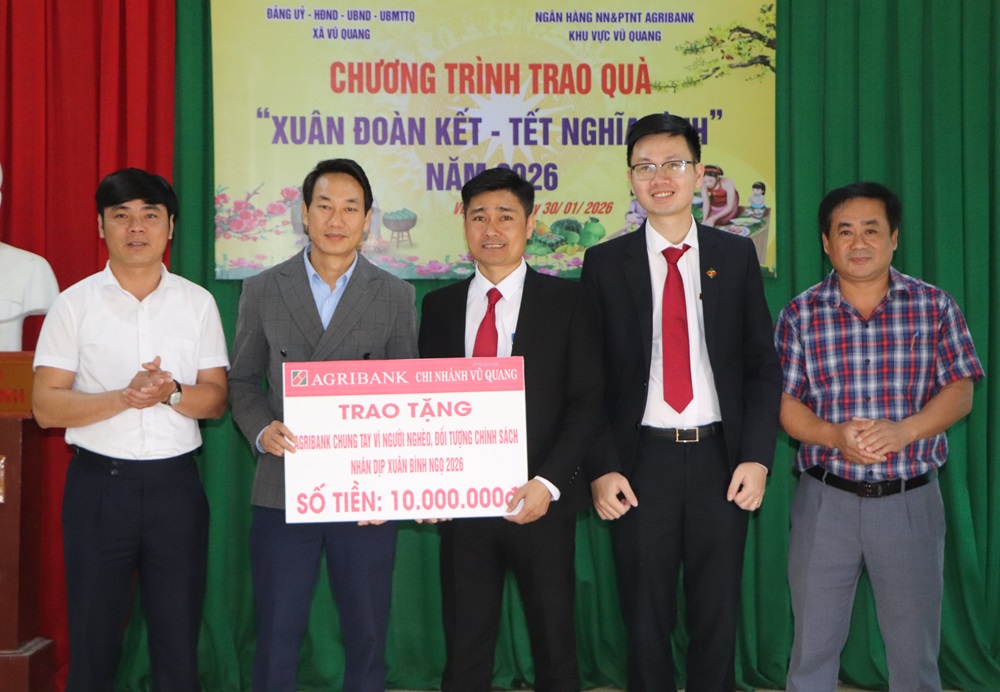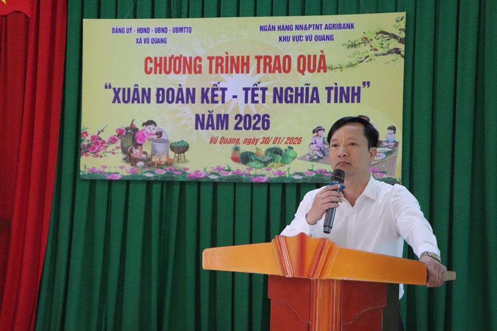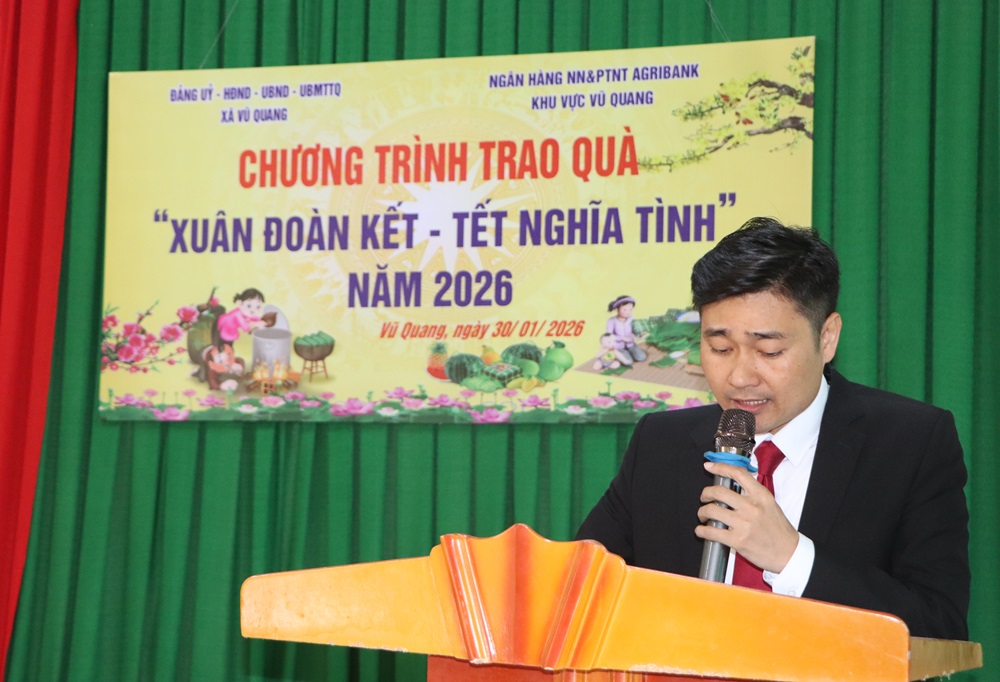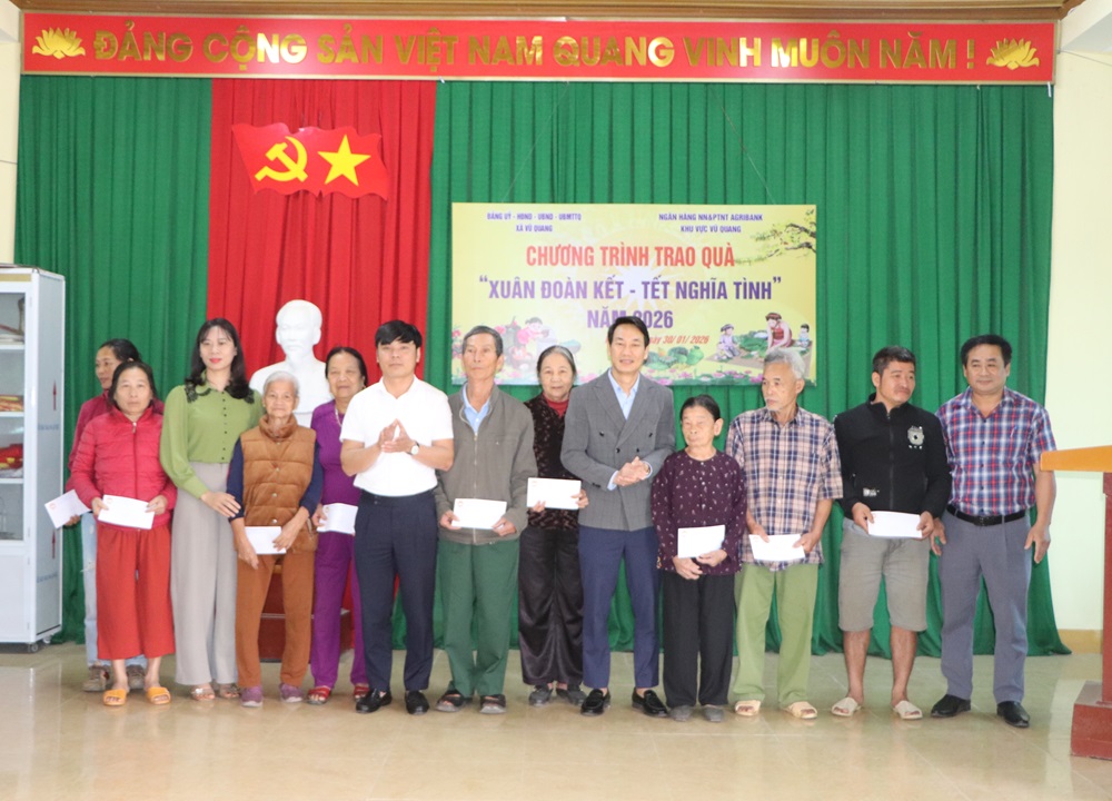 Sáng ngày 30/01, Ủy ban Mặt trận Tổ quốc xã Vũ Quang cùng đại diện Ngân hàng Nông nghiệp & Phát triển Nông thôn Việt Nam (Agribank) chi nhánh Vũ Quang tổ chức trao quà Tết cho các hộ nghèo, hộ cận nghèo và gia đình chính sách trên địa bàn các thôn ở Vũ Quang (thị trấn Vũ Quang củ) xã Vũ Quang.