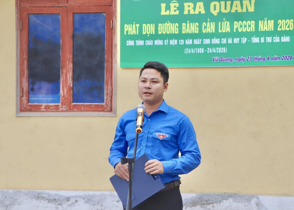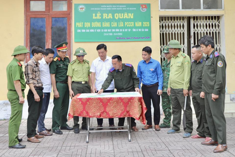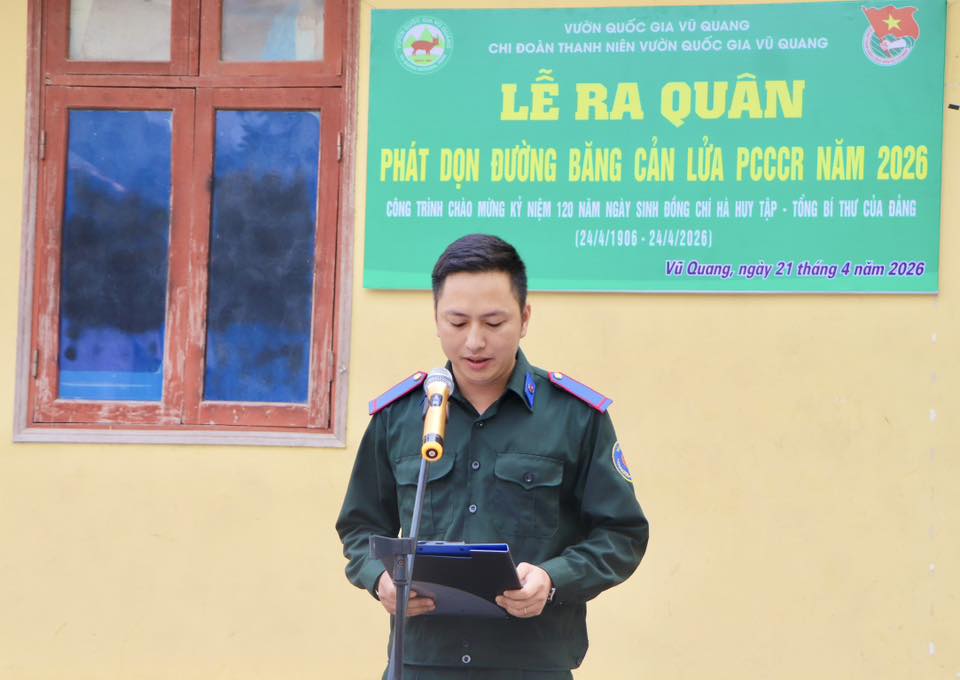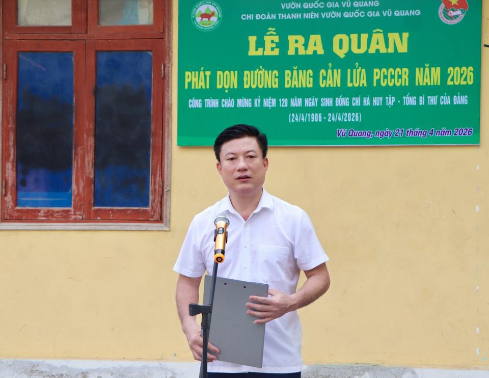 Sáng 21/4, trong không khí thi đua sôi nổi chào mừng kỷ niệm 120 năm Ngày sinh đồng chí Hà Huy Tập (24/4/1906 – 24/4/2026), Chi đoàn Thanh niên Vườn Quốc gia Vũ Quang đã tổ chức lễ ra quân phát dọn thực bì, tu sửa và làm mới đường băng cản lửa năm 2026. Hoạt động nhằm tăng cường các biện pháp chủ động phòng cháy, chữa cháy rừng trong cao điểm nắng nóng đang diễn ra gay gắt.