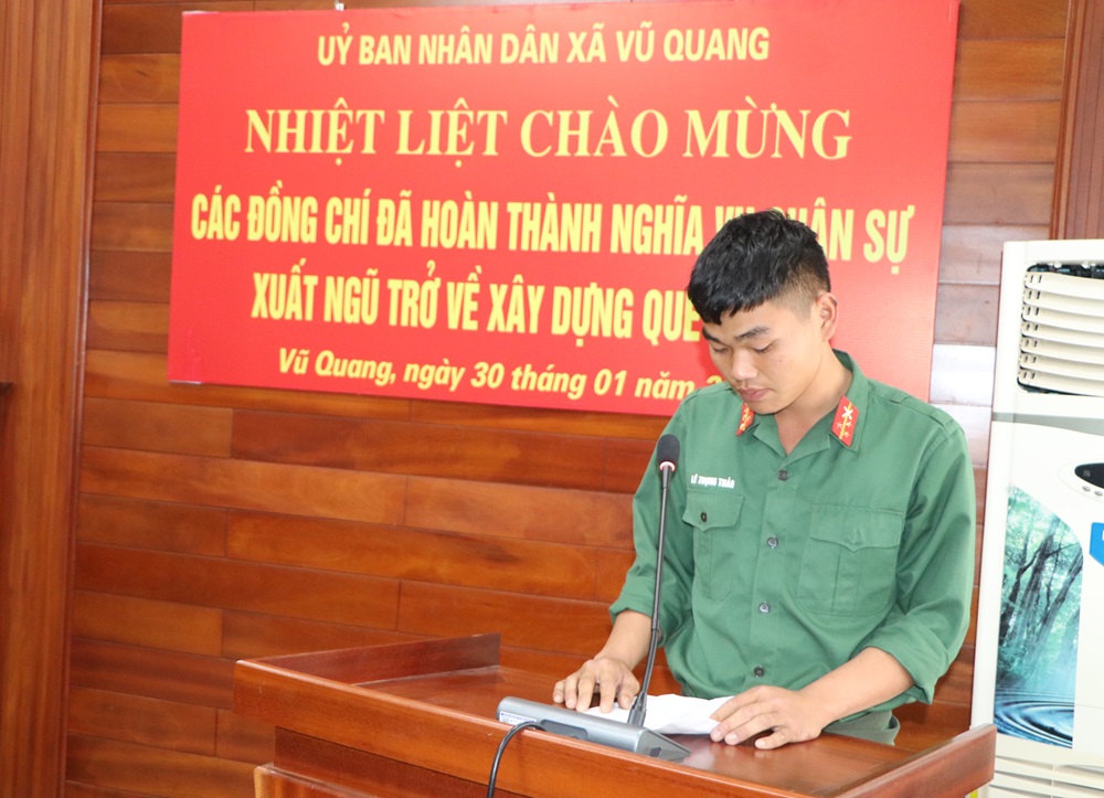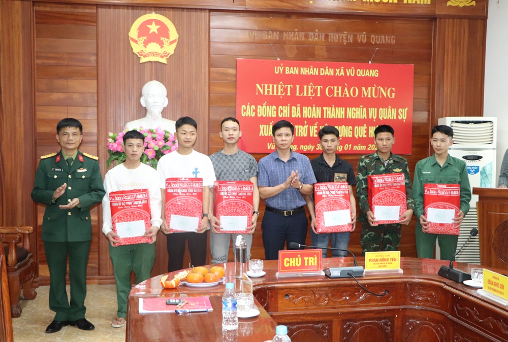 Chiều 30/1, xã Vũ Quang tổ chức gặp mặt quân nhân hoàn thành nghĩa vụ quân sự trở về quê hương. Tham dự có các đồng chí Nguyễn Văn Tiến - Phó Bí thư Thường trực Đảng ủy xã; Phan Hồng Yến - Phó Bí thư Đảng ủy, Chủ tịch UBND xã; Trần Văn Trà, Phó Chủ tịch UBND xã; Ban Chỉ huy Quân sự xã và đại diện các Phòng, Ban, các tổ chức chính trị - xã hội xã cùng các thôn trưởng có quân nhân trở về.